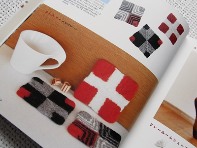 上のコースターのほか、ルームシューズの編み図が掲載されてる。