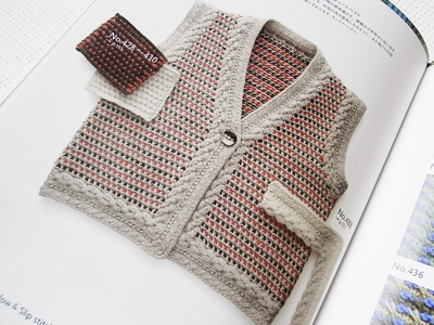 作品は、すべり目模様に縄編みの縁をつけたショートベスト。